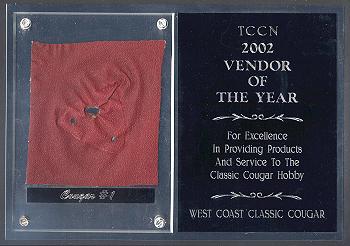| A piece of the first production Cougar's headliner now resides permanently at West Coast Classic Cougar as part of Don's TCCN 2002 Vendor of the Year award. | ![]() |